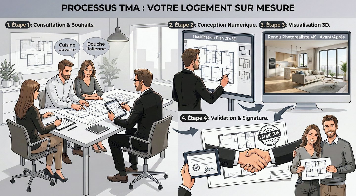 Grâce aux TMA, vous avez la possibilité de modifier les plans d’origine de votre logement en construction (déplacement de cloisons, ajout de prises, modifications sanitaires, etc.), en accord avec le promoteur.